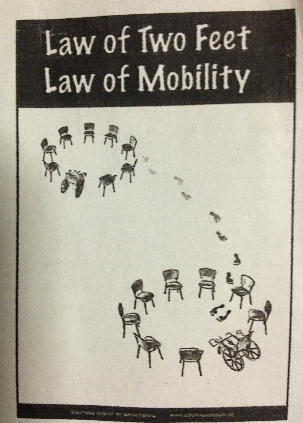 There are three principles of open space: whoever comes are the right people, whenever it starts is the right time, whatever happens is the only thing that could happen. In addition there one law: the law of two feet/law of mobility. Within the law there was freedom to be bumblebees and butterflies... those who move between conversations as the wind calls them.